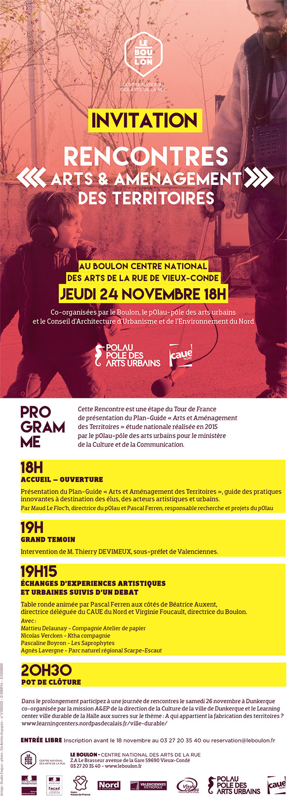 Cette Rencontre est une étape du Tour de France de présentation du Plan-Guide « Arts et Aménagement des Territoires » étude nationale réalisée en 2015 par le pOlau-pôle des arts urbains pour le ministère de la Culture et de la Communication.